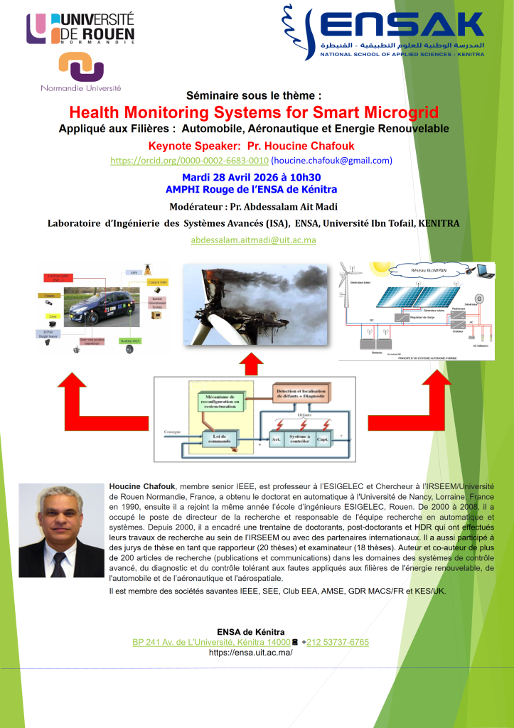 Dans ce contexte, Pr. Houcine Chafouk animera un séminaire, Mardi 28/04/2026 vers le coup de 10h30, et qui portera sur les enjeux du contrôle de la santé d’un système industriel, HMS {Health Monitoring Systems} qui vise une surveillance continue des micros-réseaux intelligents, et ce pour évaluer leur santé et identifier, éventuellement, les problèmes potentiels en temps réel.